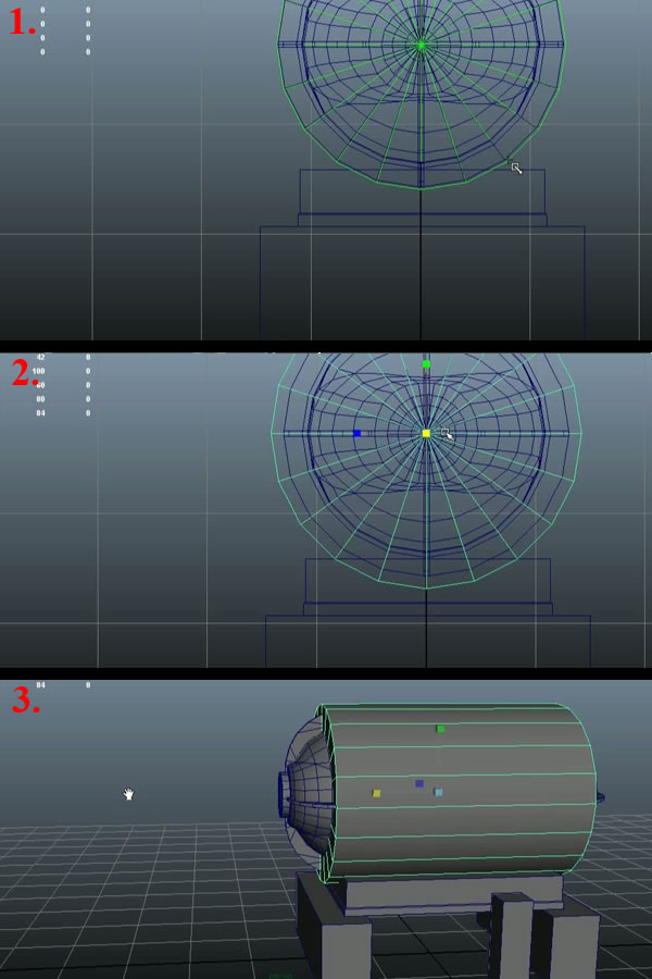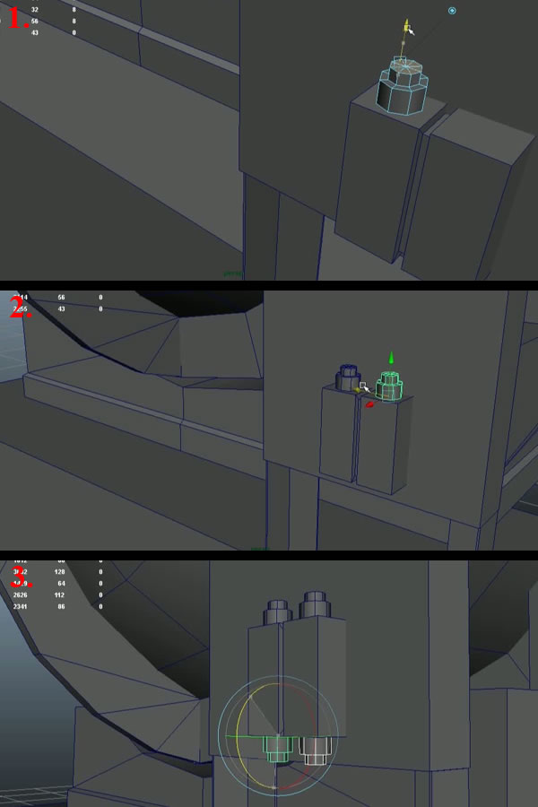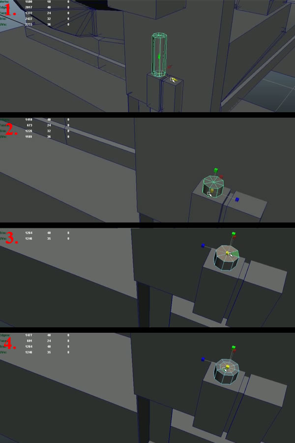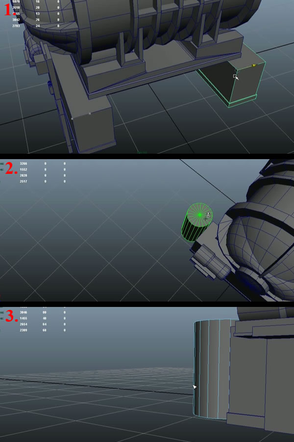 Now duplicate this leg and place it over the next one, and delete the dummy mesh (1). Now create another Polygon Cylinder with 16 sides and place it at rear (2-3).