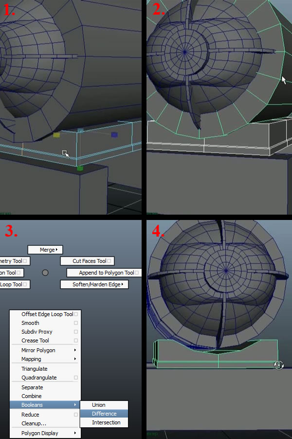 Now add edge loops in the very center of the front and side of this cube by using "Edge Ring and Split" (1). Now first select the Cube and then "Shift" select the Cylinder (2), then press "Shift+Right Click" hold and move over to "Boolean", and from the newly popped up options select "Difference" while still holding the "Right Mouse Button" (3). And this will subtract the Cylinder from the Cube mesh (4).