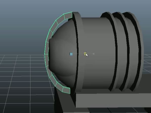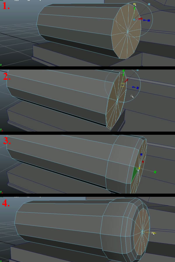 Now in "Face Selection" mode, select the 3rd ring from the center by double clicking over it and move it out a bit to match the proportions (1). Same goes with the 2nd cylinder ring (2). Now in "Vertices Selection" mode, fill in the gaps that are left (3-4).