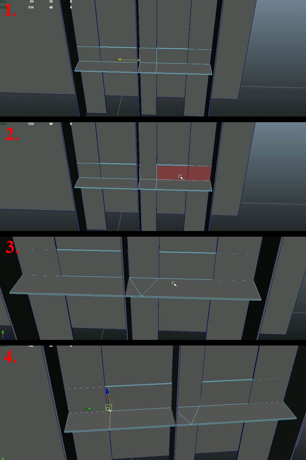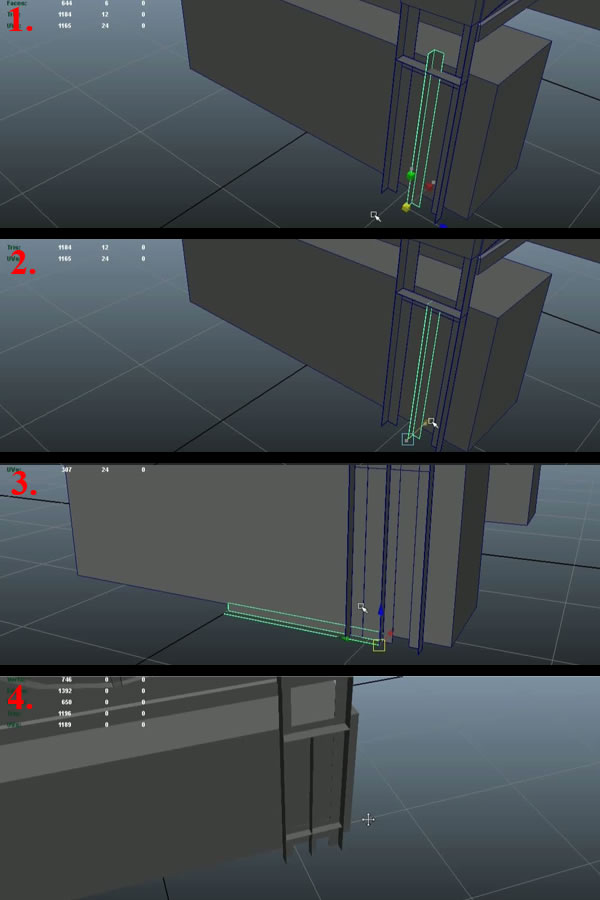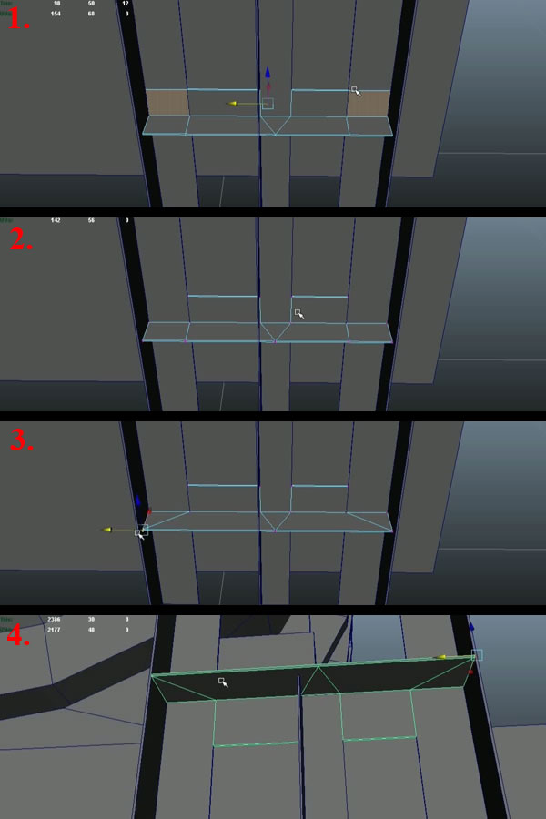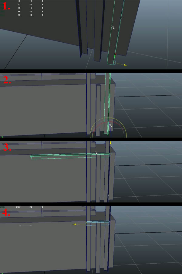 Now duplicate this angled bar to the other side, and rotate it 180 degrees in the "Y-axis", and delete the base dummy model (1-2). Then duplicate it again and rotate it 90 degree in "Z-axis" and place it on top of the middle bar (3). Finally in "Vertices" mode, adjust it's width to match the gap (4).