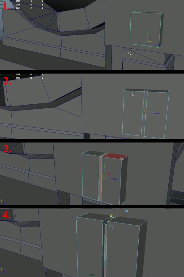 Now "Make Live" the base and create a new Polygon Cube on top of it (1). Then change it's "Pivot" to the bottom using "D+V" and delete the bottom face (2). Then split it from the center using the "Edge Ring and Split" option (3). Then using the "Insert Edge Loop Tool", add another edge loop near the corner one (4).