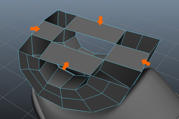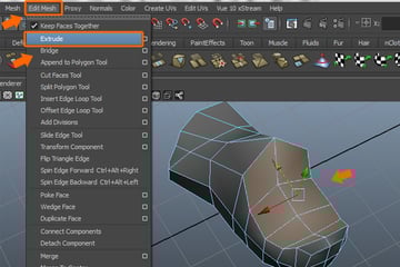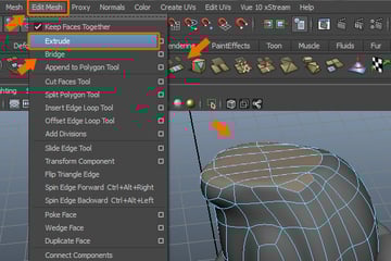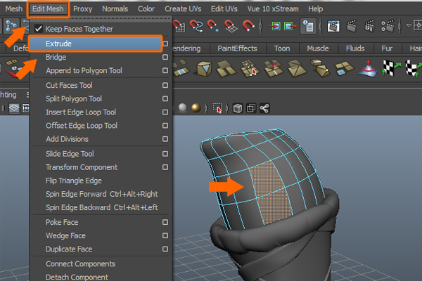 Now, we will make several cuts to add bumps to the calf to give it more detail. So with these two faces selected, go to the ‘Edit Mesh’ menu and select the 'Extrude' command.