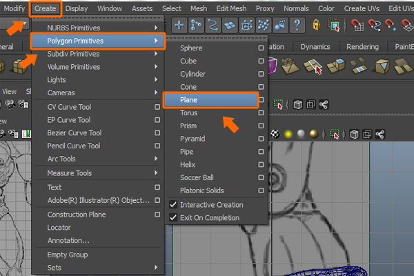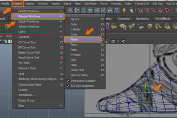 Now we will create the boot strap. So jump into the side view and go to the Create menu, click on Polygon Primitives and then select the Plane primitive.