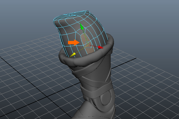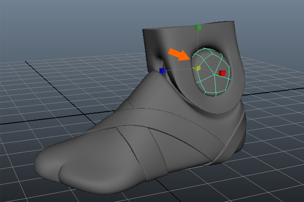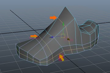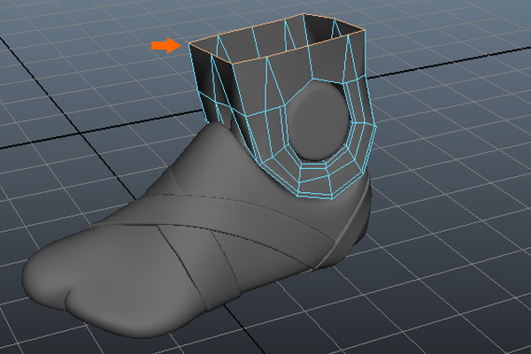First of all change the mode to Polygons and then with the boot selected, press F11 to change it into Face mode. Now, select some top back side polygon faces, then go to Edit Mesh and select the Extrude command. It will give you a chance to extrude the selected faces with subdivision.