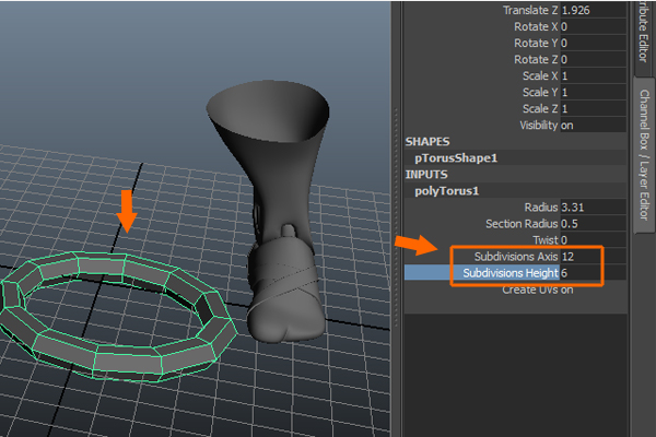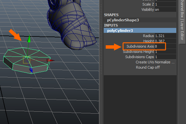 Now, let’s move ahead and model the rest of the parts for the Calf, the Knee and the Thigh. So create a new Cylinder polygon primitive and set it's ‘Subdivisions Axis’ to 8 inside the Channel Properties panel.