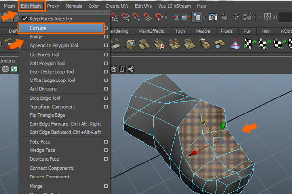 Now with the top faces selected, go to the 'Edit Menu' and select the 'Extrude' command.
