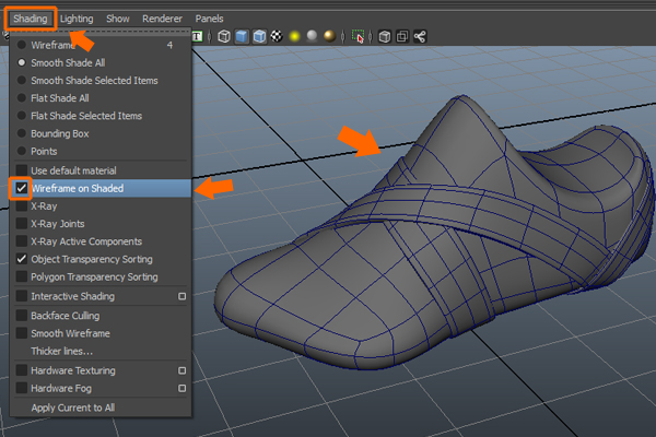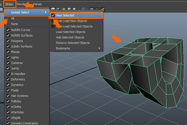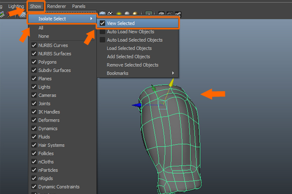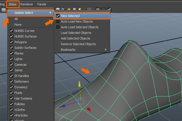 To make the workflow easier, we will isolate the object. So go to the 'Show' menu in the panel menu bar and click on the 'Isolate Select' command, then turn on the 'View Selected' check box.