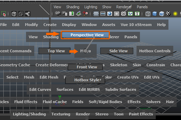 Now jump in the Perspective view by pressing and holding the Tab key and then clicking the Right or Left mouse button on the Maya menu in the center of the fly out menu and choosing Perspective View.