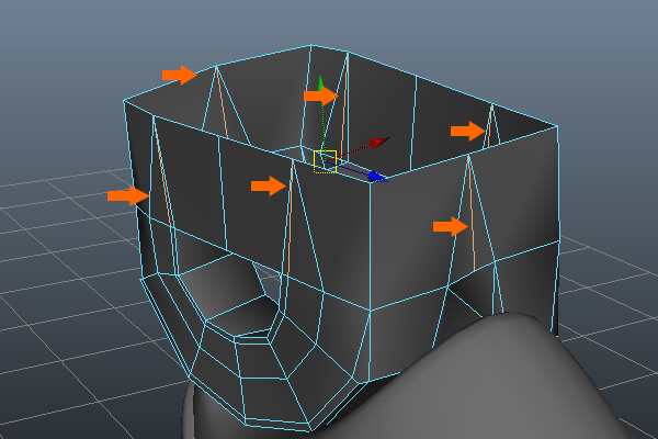 So with the ‘Split Polygon Tool’ selected, insert edges manually as shown in the image below. And then Delete the triangulated faces to make them all quad.