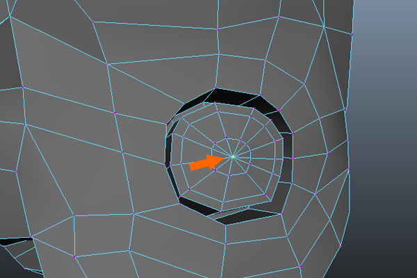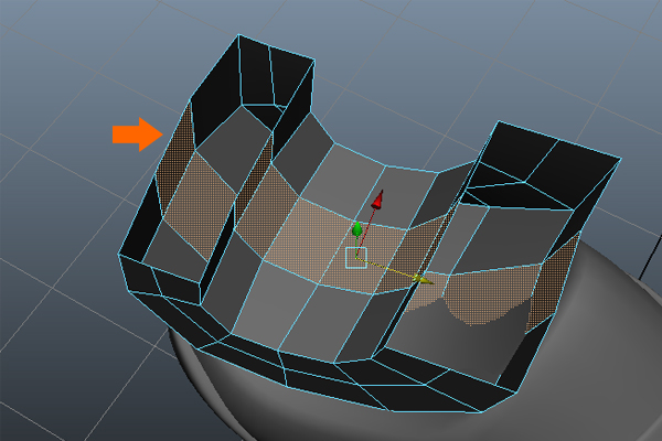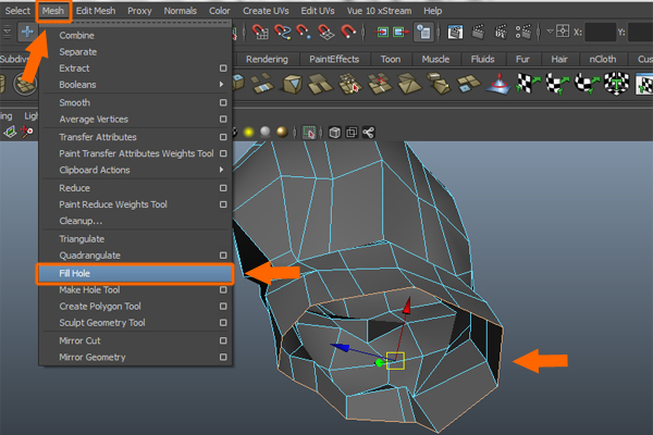 After deleting the faces, select the border by double clicking on the border edge and then go to the Mesh menu in the main menu bar, and select the Fill Hole command to fill the empty area.