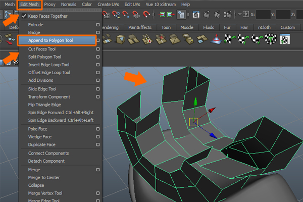 Now with the mesh selected, go to 'Edit Mesh' and then select the 'Append to Polygon Tool'.