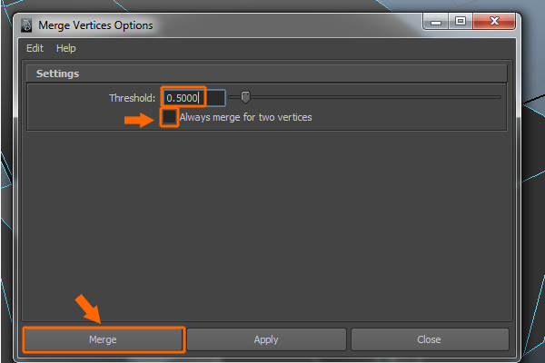 This opens the Merge Vertices Options box. Here keep the Threshold values at 0.5000 and check off the Always Merge for two Vertexes option and then click on the 'Merge' button.