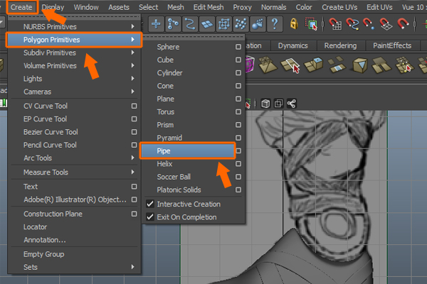 Now we will start making the next part of the boot. So go to the Create menu, click on Polygon Primitives and then select Pipe.
