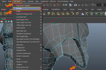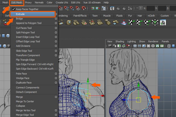 Now we’ll start by making the deltoid muscles first. So, select the outer border edge loop and then go to the ‘Edit Mesh’ and select the ‘Extrude’ command.
