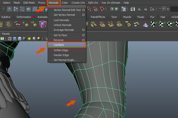To fix this problem, first select the body mesh and then go to the ‘Normals’ menu and choose the ‘Conform’ command.
