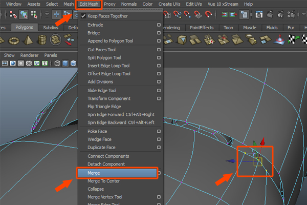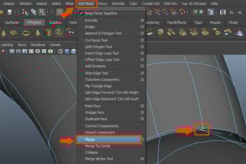 So, first we have to equal the vertex count for the parallel merge. So, select the 3 nearest vertices at a time and go to the ‘Edit Mesh’ menu and select the ‘Merge’ command to merge the selected vertices.