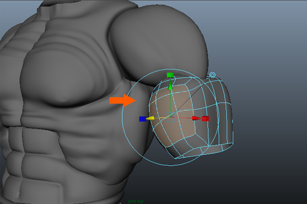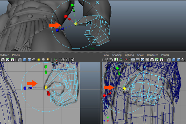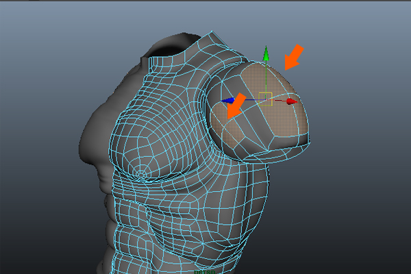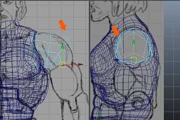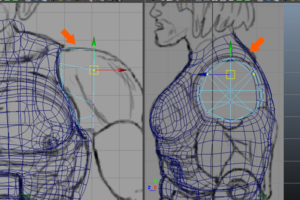 Now, Extrude the border edge loop two times, and arrange it according to the deltoid muscle shape in both the Front and Side views.
