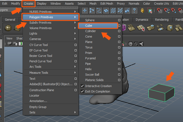 Now, we will create the hand of the character. So, go to Create > Polygon Primitives > Cube and draw a cube out in the viewport.