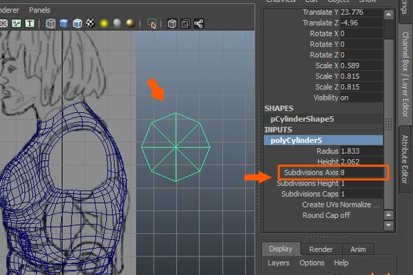 Now drag and draw the cylinder on the grid with the Subdivision Axis set to 8.
