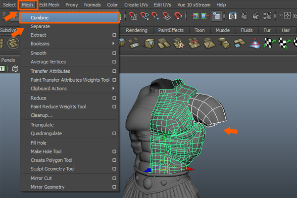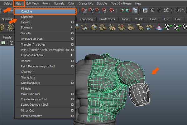 Now, select the new arm poly object and the torso poly object and go to the ‘Mesh’ menu and select the ‘Combine’ command to combine the selected objects.
