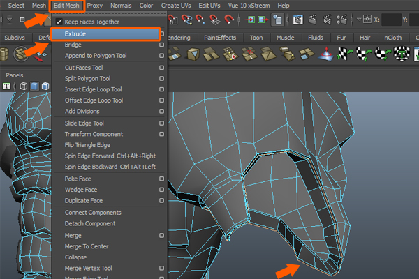 Now, press the F10 key to jump into Edge selection mode and select the outer border edges of the duplicated faces. Then go to the ‘Edit Mesh’ menu and select the ‘Extrude command’.