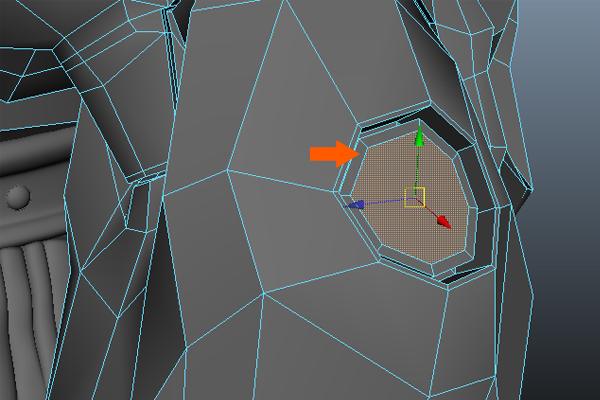 Now, press the F11 key to jump into Face selection mode and select the six faces shown in the following image. And then Extrude and Scale the faces down a little bit, to create the biceps bulge.