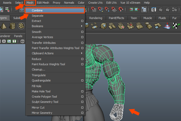 Now, we’ll combine the hand mesh with the wrist. So, first select the hand mesh and then select the body mesh and go to the ‘Mesh’ menu and click on the ‘Combine’ command.