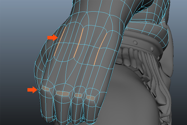 Now, we will add some more details to the hand and forearm. We need to add some more edge loops. So, insert several edge loops to the fingers knuckle area.