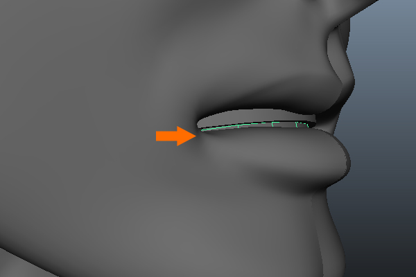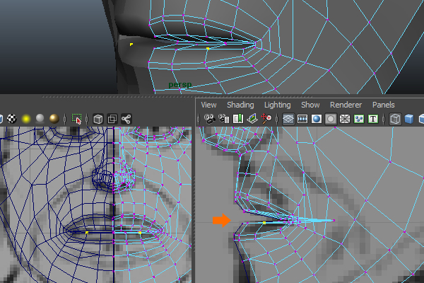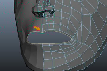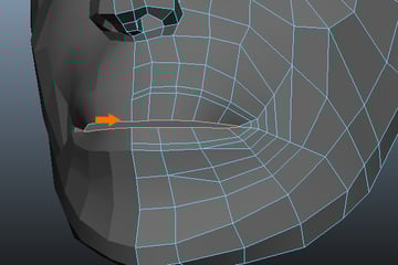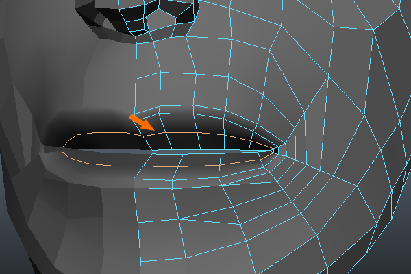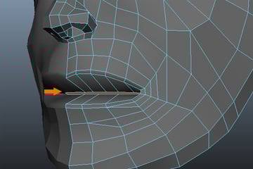 Extrude 3 lower eyelid edges down to the upper lip as shown in the image.