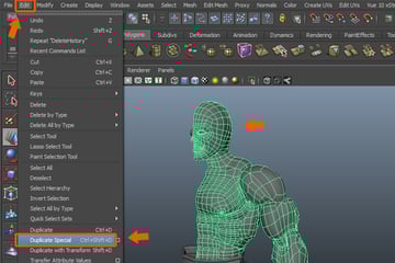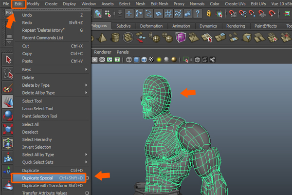 Now we have to make a duplicate of the full torso and head mesh again. So with the body mesh selected, go to the ‘Edit’ menu and select the ‘Duplicate Special’ command, to duplicate it to the opposite side.