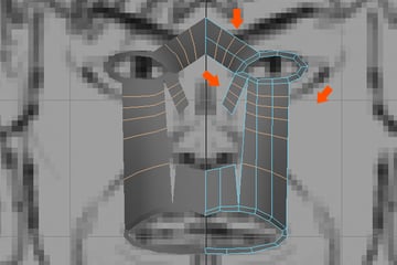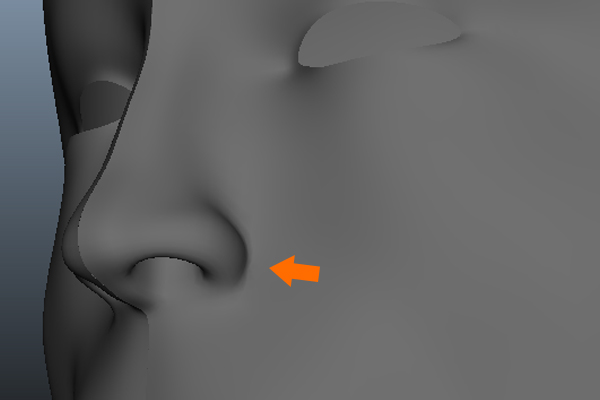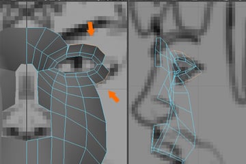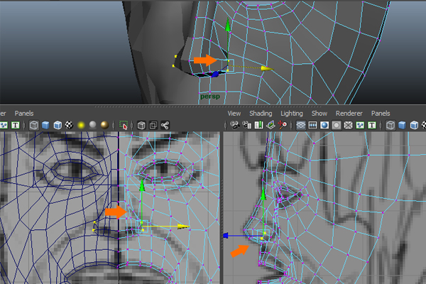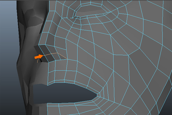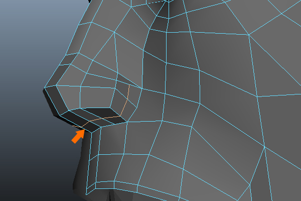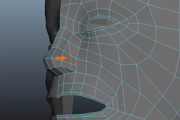Now, press ‘F10’ to jump into Edge selection mode and then select two edges around the nose area and Extrude them down according to the nose flow shown in the reference images.