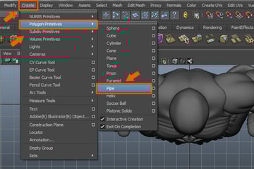 Now we'll make the teeth for the character. So jump into the Top view and then go to Create > Polygon Primitives > Pipe.