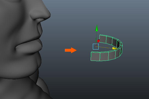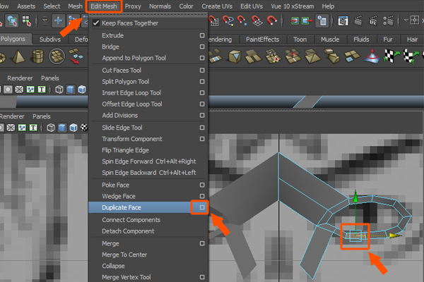 Now, we'll start creating the mouth shape. So press ‘F11’ to jump into edge selection mode and then select one lower face. With the face selected, go to the ‘Edit’ menu and click on the‘Duplicate Face’ option box to open the Duplicate Face Options window.