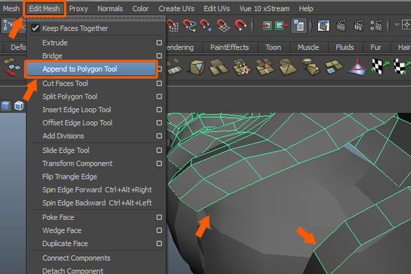 To fill the empty area, go to ‘Edit Mesh’ and select the ‘Append to Polygon Tool’.
