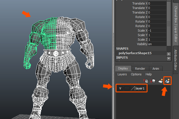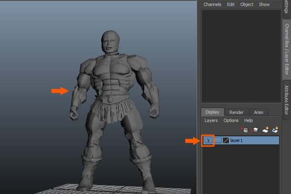 Now we'll attach the head mesh to the torso mesh. So click on the ‘Hide/Unhide’ button in the ‘Layer Editor’ panel to Unhide the layer objects.