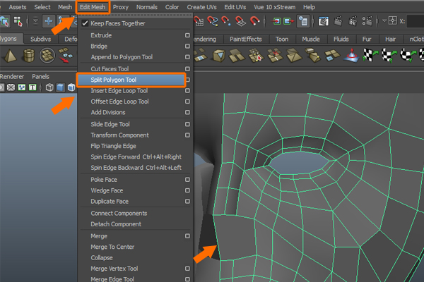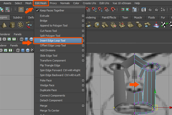 Now we will subdivide the faces for more detailing and cover the face geometry. Go to the ‘Edit Mesh’ menu and then select the ‘Insert Edge Loop Tool’.