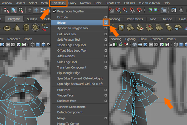 Now, select two corner edges of the eye and their corresponding edges too, and then go to the ‘Edit Mesh’ menu and click on the ‘Bridge’ option box.