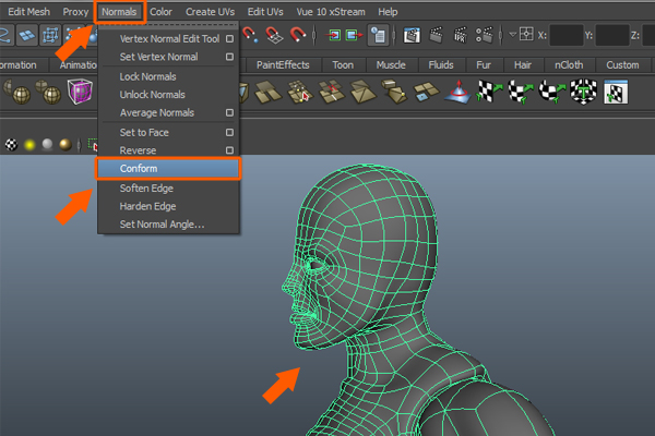 To fix this problem, first select the body mesh and then go to the ‘Normals’ menu and choose the ‘Conform’ command.