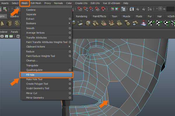 Now select the edges of the hole which was created after the bridge operation, and then go to the ‘Mesh’ menu and select the ‘Fill Hole’ command to fill the empty space.