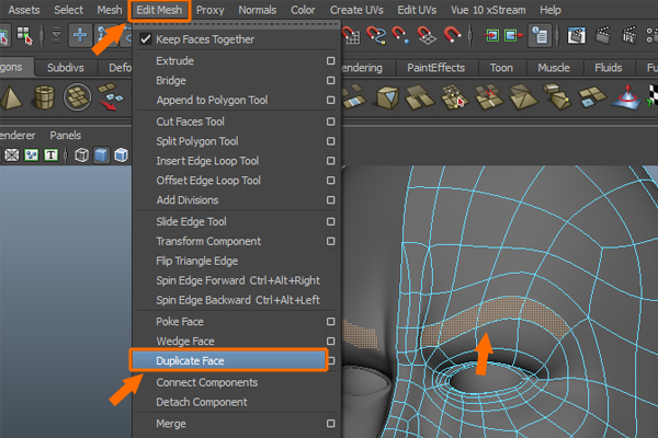 Now we'll model the eyebrows of the character. So press ‘F11’ to jump into Face selection mode and then select four continuous faces around the eyebrow area. With the selected faces, go to ‘Edit Mesh’ and select ‘Duplicate Face’.