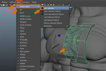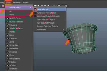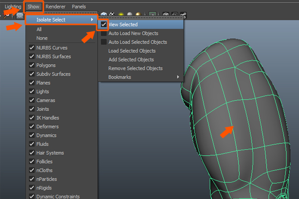 Now, with the polygon mesh selected, open the Show menu from the panel menu bar. And go to Isolate Select, and check the View Selected command option, to isolate the selected object.