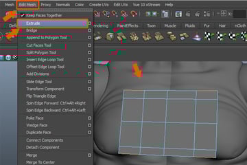 Press the F11 key to jump into Face Selection mode and select the indicated faces. Then go to the Edit Mesh menu and select the Extrude command.