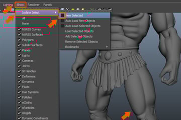 Before starting to model the armor objects, we need to refine some muscles of the character. So, with the leg part selected, go to Show > Isolate Select and then check on the View Selected option. It will hide all other objects except for the leg, so we can now work on the leg quite easily.