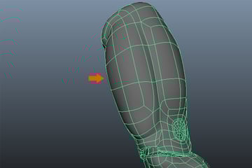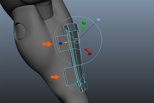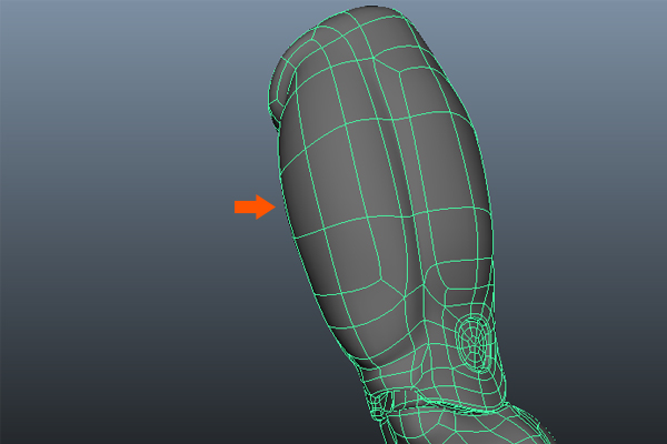 With the Split Polygon Tool selected, add edges around the thigh (front) and hamstring (back) muscle bulges to make the sharp cuts as shown in the images below.