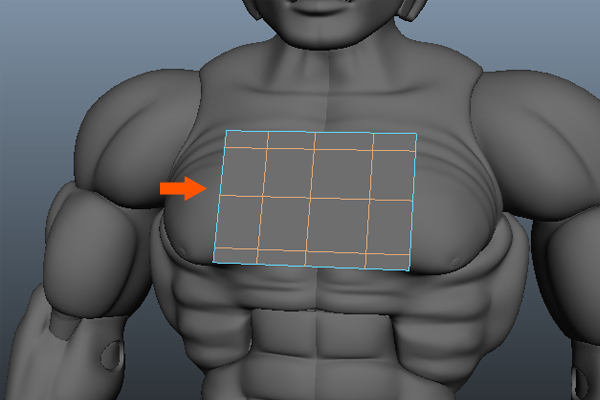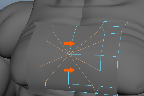 To create the design on He-Man's chest armor, we need to insert several edges as shown in the image. So, insert the edges with the help of the Split Polygon Tool.
