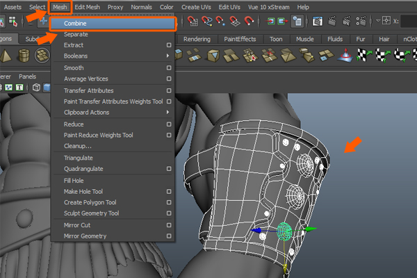 Now, select all the wrist armor objects on the right side. And go to the Mesh menu and select the Combine command, to attach the selected polygons together.