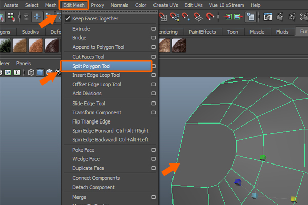 We need to insert several edges for a more smooth and rounded shape. So, go to the Edit Mesh menu and again, select the Split Polygon Tool.