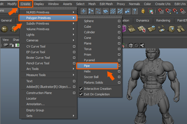 Now, we will create the wrist armor for He-Man. So, go to Create > Polygon primitives > Pipe.