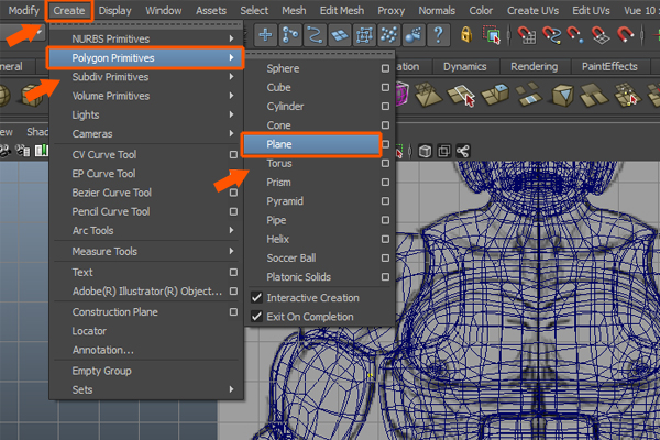 Now, we will start creating the body armor for He-Man. We will make it with the help of a polygon primitive object. So go to Create > Polygon Primitives and select Plane.