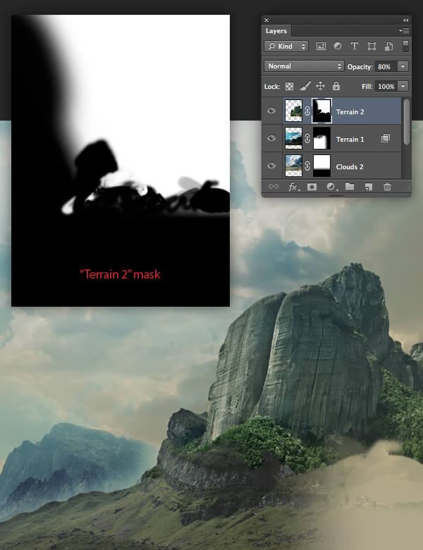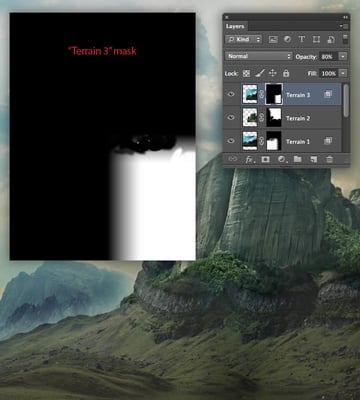 Add a mask to the "Terrain 1" layer, then Shift-drag a couple of Linear Gradients (G) to hide the top and right sides. Next, select the Brush Tool (B) and paint with a large, soft-edged tip to modify the mask as shown.